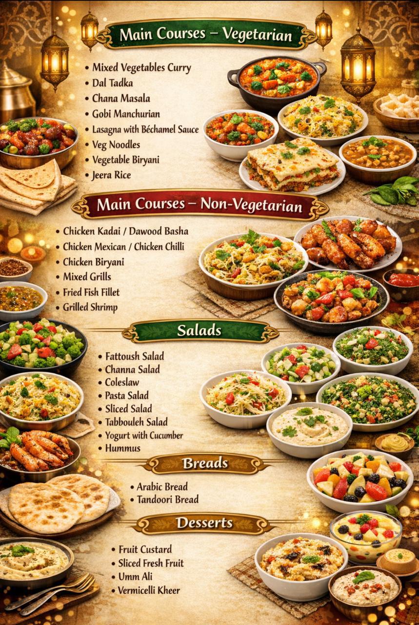 Music of your choice i.e. Arabic, Indian, English - Menu with veg and non-veg meal courses